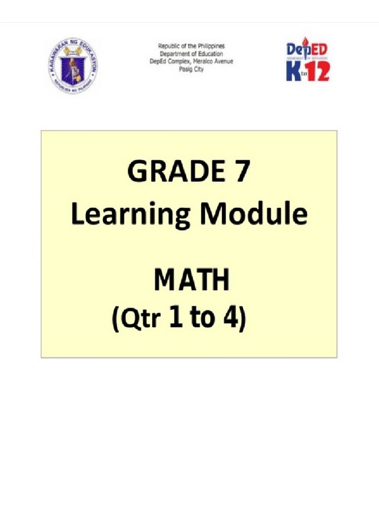 K To 12 Grade 7 Learning Module In Mathematics Q1 Q2 Free Printable Math Worksheets 7th Grade Math Problems 7th Grade Math